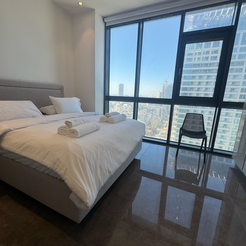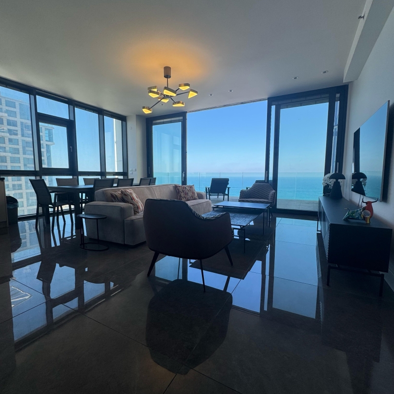 A large and bright apartment in Tel Aviv, located near the beach. The apartment includes a large balcony with a sea view and three bedrooms, one of which is a particularly spacious master bedroom. The apartment offers stunning views of the sea and the city, visible from every window.