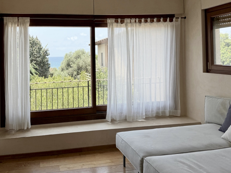 The entrance level features a living room and kitchen, a bright salon opening to a landscaped garden, a green courtyard with a private swimming pool, and windows of various sizes overlooking the gardens, the pool, and even the sea.