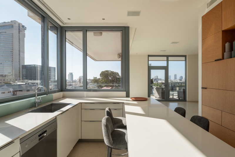 The apartment faces the front of the building with open views of Rothschild Boulevard and the sea to the west.